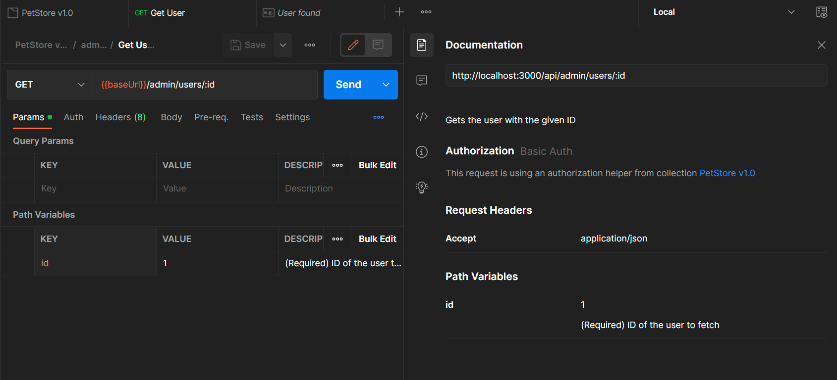 At the Collection level, we will configure Postman to use the default user’s credentials. At the “admin” folder level, we will configure Postman to override the Collection’s default Authorization to use the admin credentials