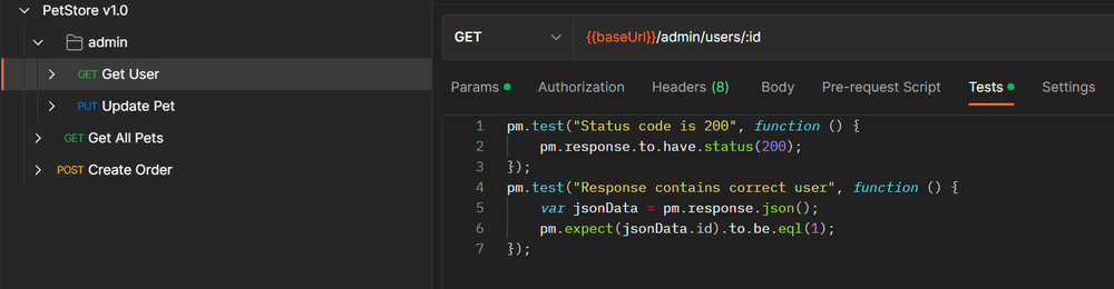 For our API, we want to write tests on each request that can verify the functionality of our application. We can start writing tests by navigating to the Tests tab on any Request in our Collection