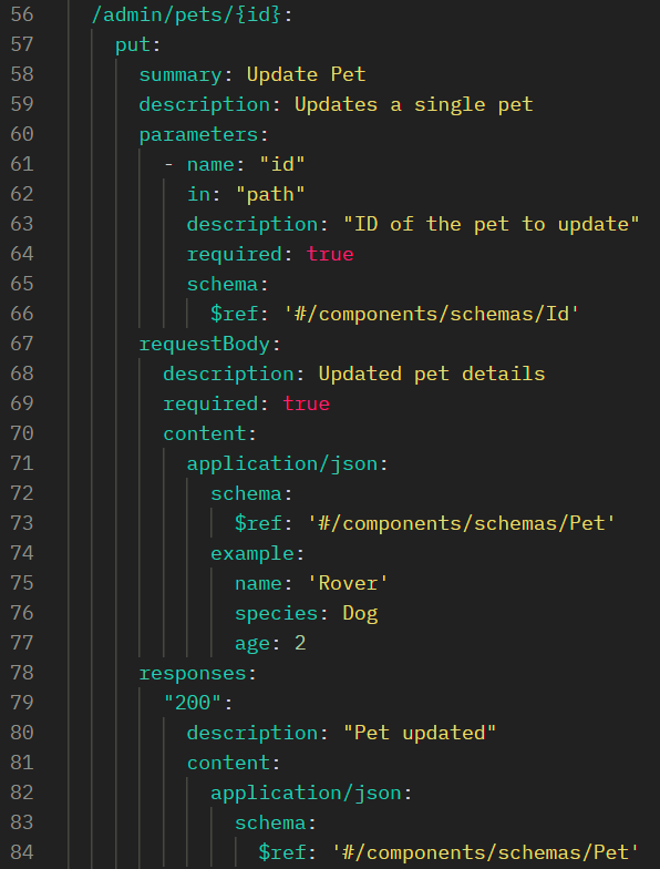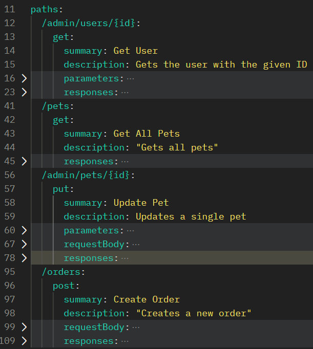 For now, we will ignore the parameters, requestBody, and responses fields on each path, but we will revisit them later. For more details on the paths field, see the OpenAPI 3.0 documentation.