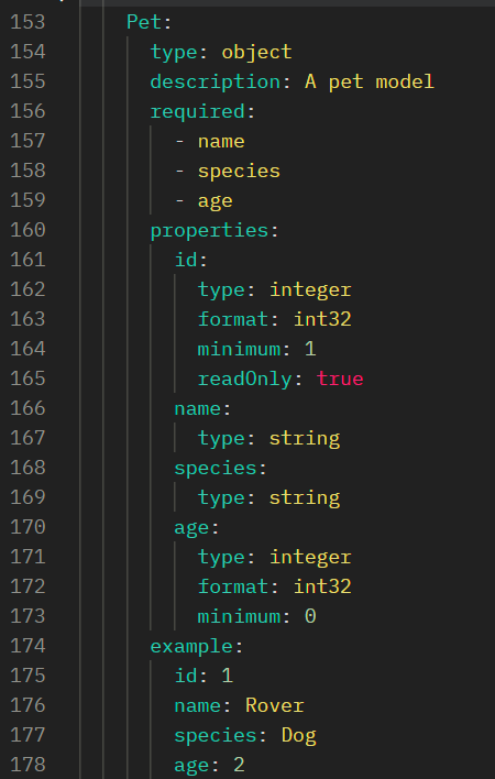 Important fields to note here are the description, properties, and example fields: