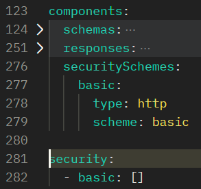 Here, we have specified that our API uses HTTP Basic authentication for all its endpoints. You can also define security at the path level, or even method level if you need to. For more information about the security and securitySchemes objects, refer to the OpenAPI 3 documentation.