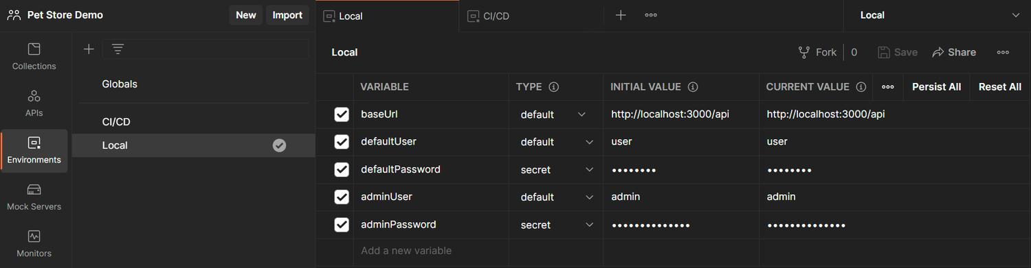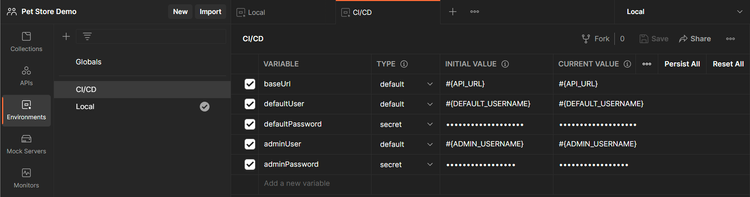 Each Environment contains variables that Postman will substitute into our Collection depending on which Environment it is configured to run in. In the “CI/CD” Environment, we can placeholder values that can be replaced either manually or programmatically when running the Collection during CI/CD builds.