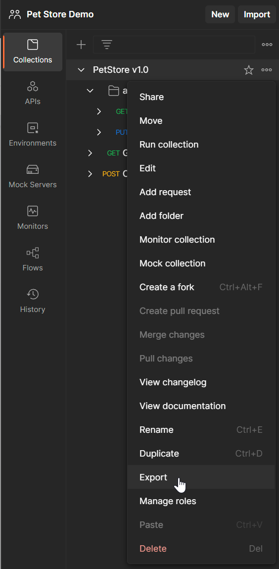 ‘.\collections\Petstore v1.0.postman_collection.json` – This is the path to the exported Collection