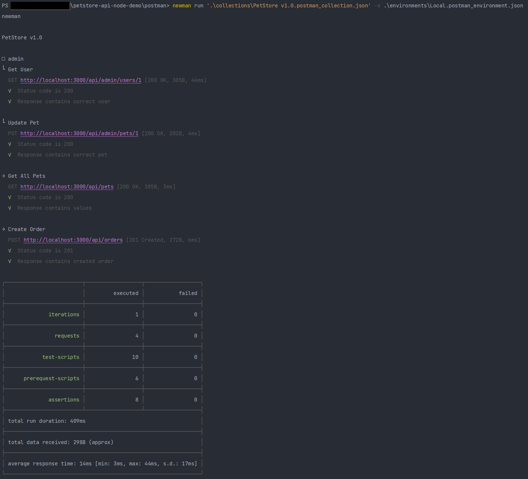 -e .\environments\Local.postman_environment.json – This uses the -e command option to tell Newman which Environment file to use with the Collection