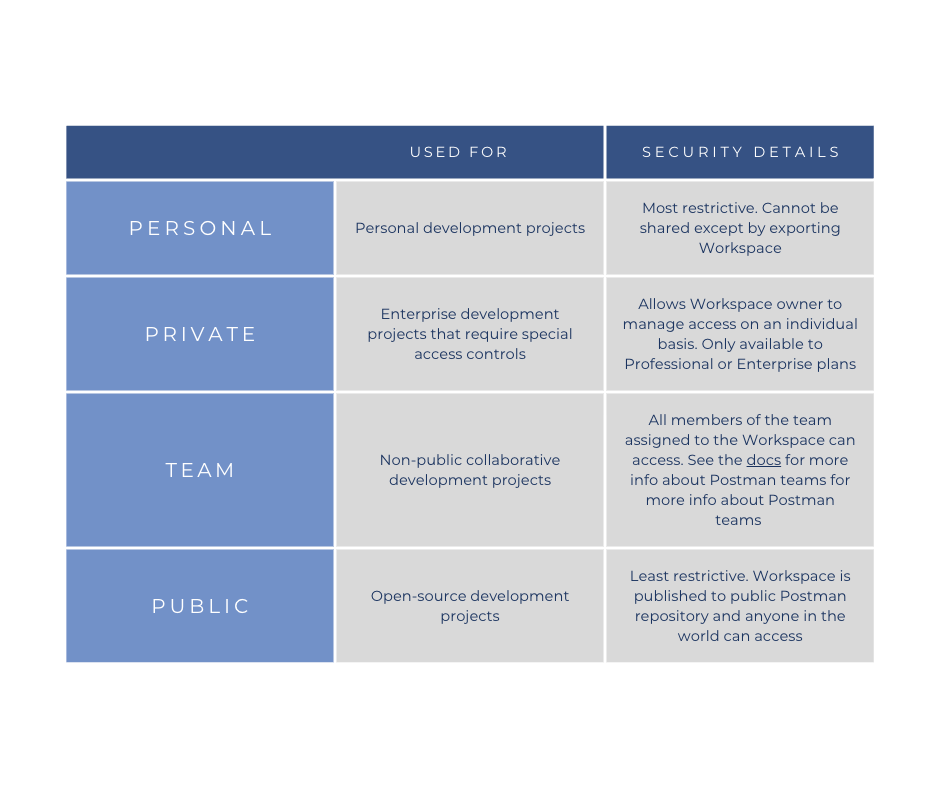 In our case, we will use the “Team” option in order to demonstrate what a typical shared Workspace environment would look like. For more details on all the security features of Postman Workspaces, see the documentation here.