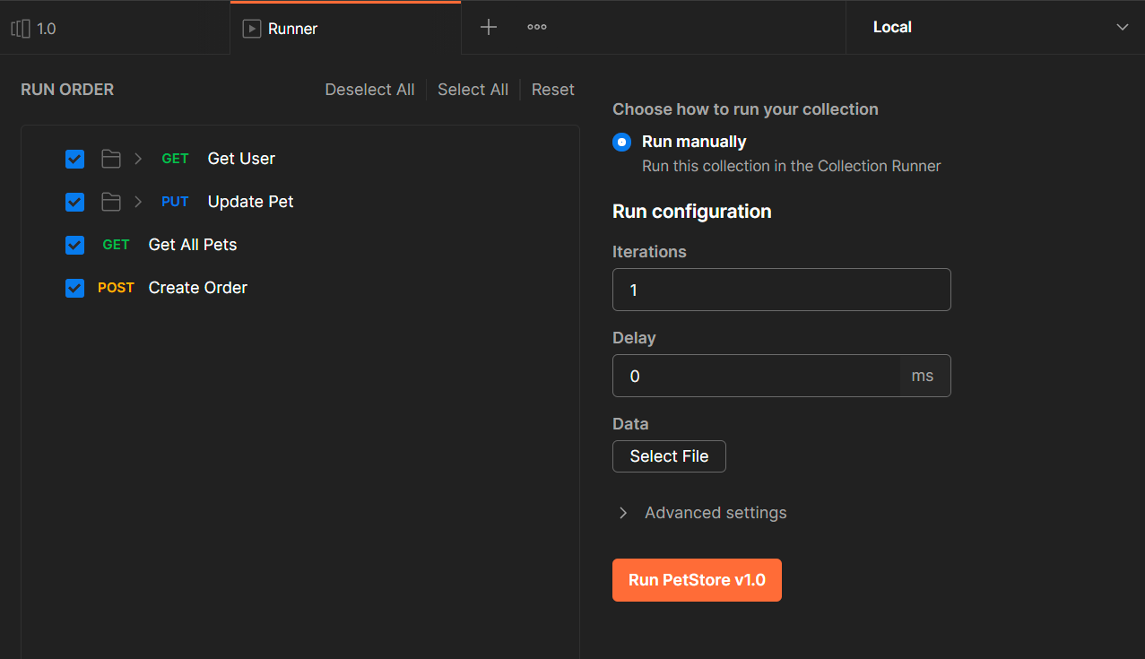 Configure the Collection Runner to use the default values. Now, select “Run PetStore v1.0” to run the Collection: